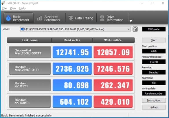 在TxBENCH测试中,铠侠VE10的顺序读写都是12000+的水平,跟CrystalDiskMark测出来的成绩很接近。