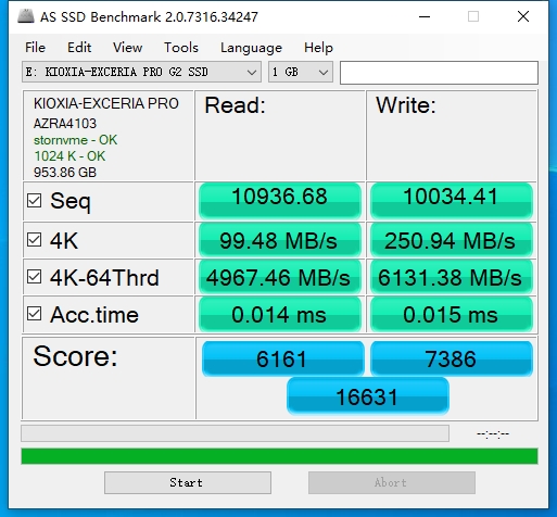 AS SSD也是大家常用的跑分软件,铠侠VE10跑出了16631分的总分。由于AS SSD的特性导致所有硬盘的成绩都偏低,因此总成绩更有参考价值,大家可以跟手里的硬盘跑分做个对比,如果差距达到一倍以上,升级铠侠VE10带来的提升就会比较明显了。