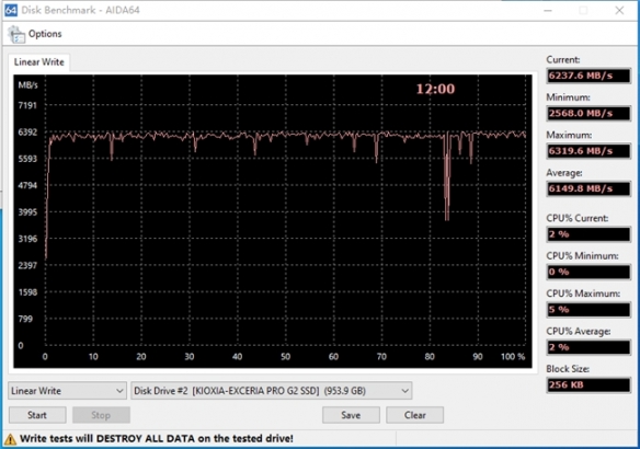 AIDA64不仅可以测试CPU的性能释放,也有用于测试存储设备的专用模块。不仅可以用于衡量其性能,还可以检测它们可能存在的任何问题。在这里,我们选用最严苛的Linear Write(线性写入)来进行测试。由于是全盘写入,很多硬盘在写入20%后都会断崖式掉速。这次铠侠VE10给到了更大的惊喜,几乎全程稳定在一条直线上,即使在末段也跟开头一样强力。