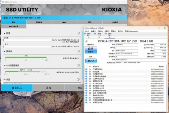 接下来,我们就来检验下铠侠VE10的成色。先打开铠侠自己的管理软件SSD Unity,这里可以看到寿命和温度等信息,并且可以检查硬盘固件是否为最新版本。接着我们用CrystalDiskInfo和它相互印证下,确认各项参数和状态基本无误:PCIe 5.0×4传输模式、NVMe 2.0标准。