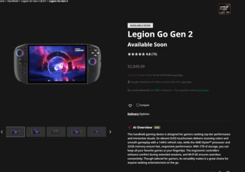 当前,联想北美官网显示Legion Go 2已经没货,但价格虚高:2TB存储版本的Legion Go 2现已标价2849.99美元,约合人民币19480元,接近2万元。