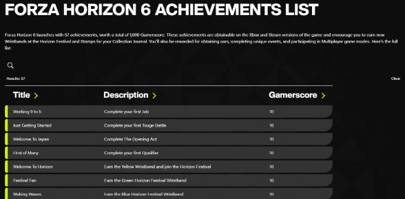 成就涵盖多个方面:完成任务和战役、全新的“斗牛”战斗模式、PR特技、Horizon Rush 活动,以及探索日本时的日志收集。在探索过程中,玩家还需要寻找宝藏车辆、解锁地标和区域、摧毁 200 个区域护符以及 200 个奖励看板。此外,还有诸如赢得比赛、在剧情任务中获得星级等常规成就。