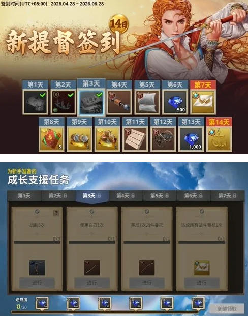 为帮助新人提督顺利启航,游戏设计了完善的福利体系。新提督14日签到活动每日登录即可领取蓝钻、旗帜、扫荡券等实用道具,累计可获得赤龙号船只、A级旅馆航海士自选券等珍稀奖励。同时开启的新手成长支援任务,通过七日任务体系帮助玩家逐步掌握游戏核心玩法,每完成一个任务都能获得蓝钻、角色装备等奖励。