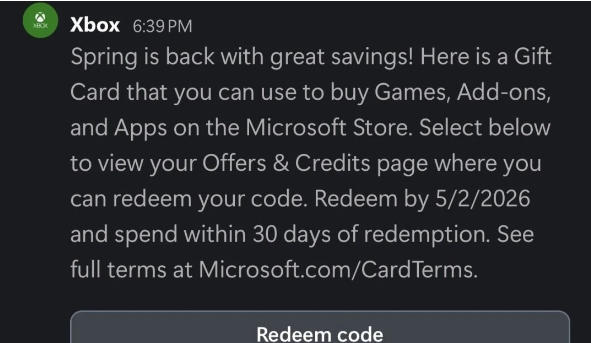 该福利会出现在Xbox账户菜单的消息板块中,符合条件的主机、PC及Xbox云游戏用户,都能在这里找到标有Xbox官方留言的奖励。上述留言以春季到来为主题,告知用户可借此机会在微软商店以“超值优惠”购入游戏、附加内容与应用程序。获选用户需前往“优惠与余额”页面兑换礼品码,完整条款与细则可查看Microsoft.com/CardTerms。