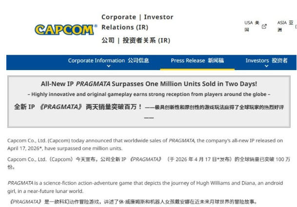 卡普空今日宣布,于2026年4月17日发售的科幻动作冒险游戏《识质存在》,全球销量已在两天内突破100万份。本作讲述主角休·威廉姆斯与机器人少女戴安娜在近未来月球世界中的旅程。
