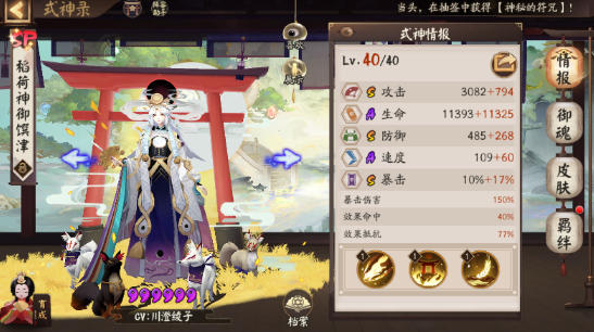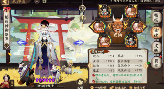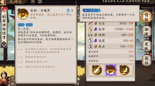 2. 生存能力突出,站场稳定:她的面板是3S(攻击、防御、暴击)+2A(生命、速度),满级40级攻击3082、生命11393、防御485,实测中搭配肉御魂,能轻松扛住主流输出2-3次攻击,比同定位的SSR御馔津生存能力强30%左右,适合长期站场拉扯对战。